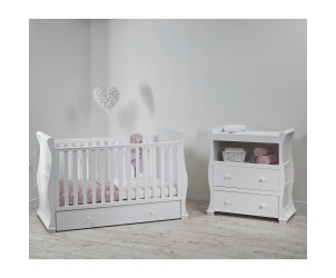 The sleek sleigh design has 3 adjustable base heights, 2 fixed sides and 2 protective teething rails. The dresser has a beautiful sleigh shape with elegant curves. The 2 full width drawers provide lots of storage space, while the open shelf area keeps nappy changing essentials close to hand. The dresser top takes a standard changing mat.