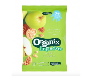 Organic rice cakes coated with apple juice & cinnamon baked and puffed into chunky circles, sized for little fingers.