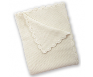 Knitted in 100% cotton, the blanket features a hand-crocheted scalloped edge, and comes in several colours to suit all babies and nurseries.
