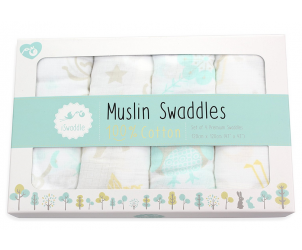 Fun iSwaddle branded muslin swaddle blankets in unisex turquoise and yellow colours.