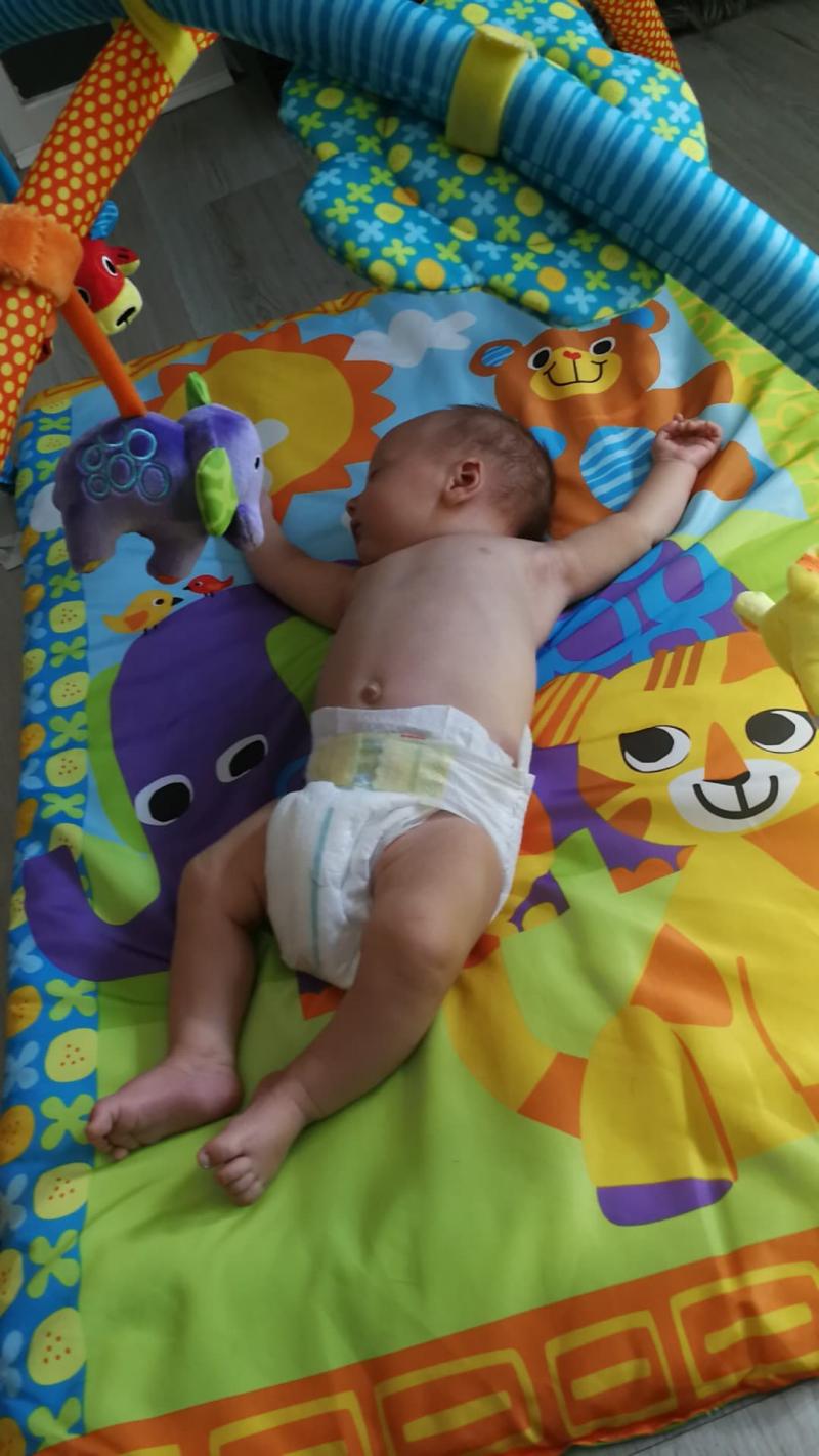 This play mat is fab. It's a large rectangle with a thick sqidgey base. The toys attached to the bars can be adjusted and moved into a position that suits. The bars are easy to attach and take off with no fiddly bits. Bright colours and very interesting for babies. - Strengths: