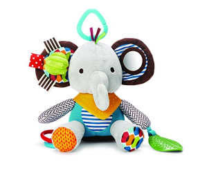 This friendly elephant includes a removable textured bandana teether that can be fixed elsewhere, when baby needs relief from sensitive gums.