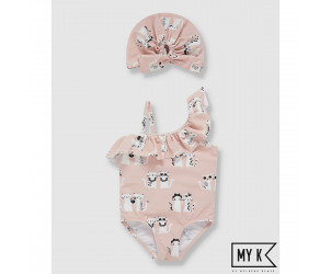 This My K cat swimsuit and turban is an adorable addition to any little girls' wardrobe.
