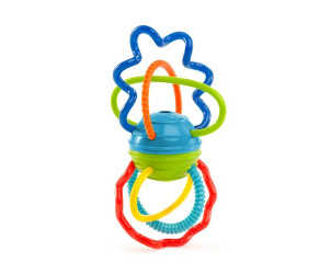 The Oball Clickity Twist is a portable activity centre designed for little hands. The multi-texured and vibrantly coloured arms and spirals are a joy to pull or chew (ideal for sensitive gums) and the centre ball twists and rotates with great clicking sounds.