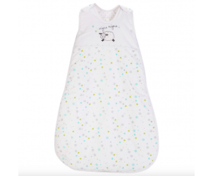 White cotton sleeping bag with beautiful prints, applique and embroidery, sure to keep baby warm all night long. Features a zipper to allow access for easy nappy changes.