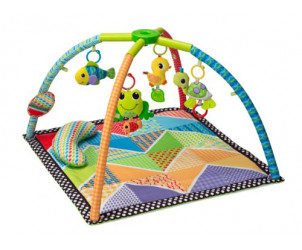 This activity gym is filled to the brim with fun features and plush toys for play.