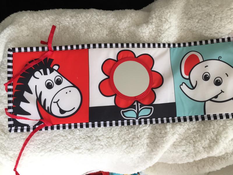 We found the 2 best uses for this were in the Moses basket. and around the play mat. It helped attract babies attention when they couldn't fully roll over. Also when they could roll the mirror and black and white pattern was good for keeping my son happy. It has ties to help keep it in place. We always supervised its use, as baby could get over stimulated quickly. It didn't always stand up very well so we normally propped it up. It has ties you can use to secure it. - Strengths: