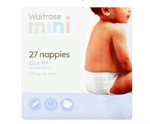 Waitrose Mini essential nappies, size 4+, maxi plus are suitable for little ones weighing 9-20kgs or 20-44lbs.
