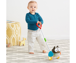 Skip Hop Explore and More Rolling Owl Push Toy: Babies will enjoy holding this friendly owl's handle for support when learning to walk. The beads in his tummy jostle and his wings flap as he rolls along.