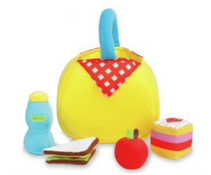 The Galt Toys Fill and Spill Picnic Basket is a soft picnic basket complete with a sandwich, cake, apple and drink. Baby can tip the soft picnic toys out of the basket and start again. Soft velour bottle, apple rattle, cake with squeaker and two-piece crinkle sandwich to join together with Velcro. A young child will enjoy carrying their basket of goodies and having an imaginary picnic. Machine washable.