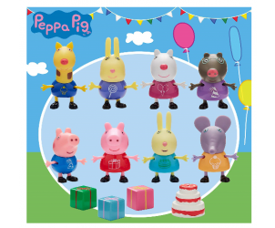 Peppa Pig celebration pack of figures comes with exclusive party designs! Each figure is articulated with moving arms & legs. Includes all your favourites Peppa Pig, Emily Elephant, Molly Mole, Suzy Sheep, Rebecca Rabbit, Gerald Giraffe, George Pig and Richard Rabbit, as well as party gifts and a cake! Styles may vary. For ages 3 years and over.