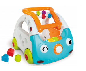Suitable from 6 months, in low position, with the wheels blocked, little one sit and plays to embed the shapes and to the ball ramp. Starting from 9 months, in the middle position, with the wheels blocked, your child learns to stand alone, and to be able to play with the 2 spin bars located on the handle. And from 12 months, in high position, the wheels unlocked, baby will learn walking. the headlights light up. funny sounds by pressing the colored keys and large button on the hood.