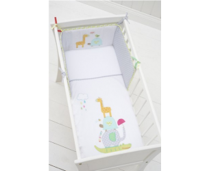The Babies R Us Jungle Friends Crib Set is a great starter set for your baby's nursery. It includes a coverlet, bumper and fitted sheet that features cute jungle friends on a white background.