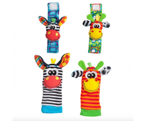 Just place the sock-like foot finders onto baby’s feet and use the Velcro straps to secure the wrist rattles, then watch as your baby plays with the animal characters made of soft and silky fabrics.