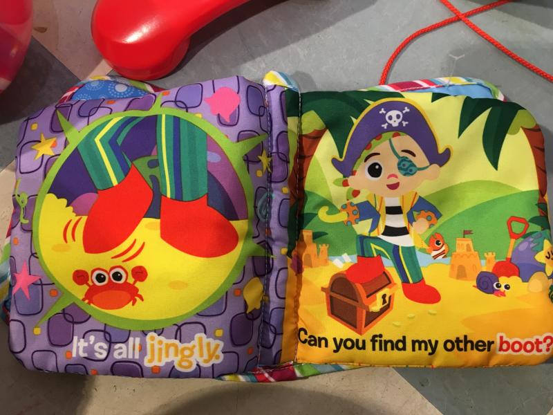 The fabric book is lightweight so at 9 months old he could easily hold it and turn the pages. The pages crinkle like crisp packets and one of the pages has a squeak in it. The pirate ‘horace’ is a lovely addition to the book but can be played with separately, it’s lovely and colourful as you can expect from Lamaze and it has a bell inside so baby can hear it when playing.