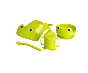 This set with a frog motif has everything your baby needs to eat and drink autonomously – and a bib to catch any misses!