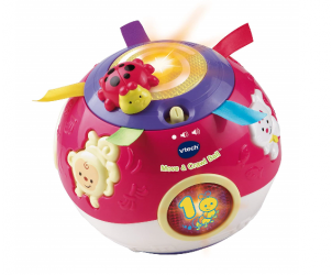 Chock-a-Block full of fun things to press, pull, spin and feel -- the 'Move & Crawl Ball' from VTech introduces shapes, numbers, animals and animal sounds to your active baby.