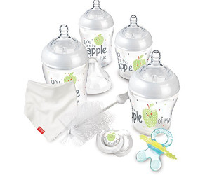 The Nuby Natural Touch Newborn Starter Set comes with two 180ml and two 270ml feeding bottles with easy latch teats, a bib, a bottle and teat brush, a soother and a teether.
