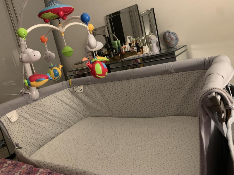 I purchased this a few months before my due date. I always knew I would buy this even before I was pregnant! It is so easy to assemble and use, and I love the fact that the height is adjustable and can be tilted from one end to help with baby’s reflux. It has fitted comfortable in our not so huge bedroom, and matched the colour scheme perfectly. The one side that can be zipped down is a dream as I can so easily get to my baby without getting out of bed, for night time feeds and cuddles.