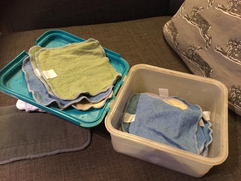 I was determined to use cloth nappies as soon as my little boy had grown out of the spindly-leg newborn phase. I thought I’d go the whole hog and get cloth wipes too. I bought a kit from Cheeky Wipes which included these cotton wipes and boxes for clean and dirty wipes, plus essential oil to add to the wipe water (optional).