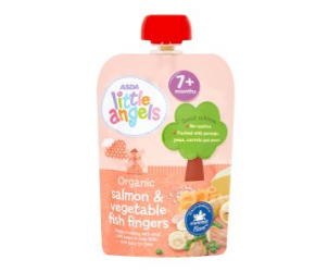 Asda Little Angels Organic Salmon & Vegetable Fish Fingers Pouch 7m+ is made with salmon, parsnips, peas, carrots and onions.