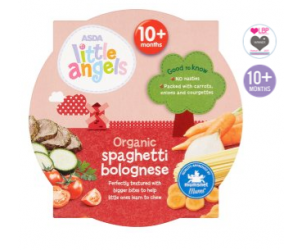 Asda Little Angels Organic Spaghetti Bolognese 10m+ is made with beef, carrots, onions and courgettes. Well textured with bigger bites.