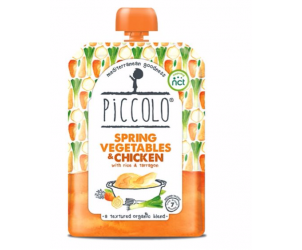 The Piccolo Organic Spring Vegetables & Chicken with Rice and Tarragon 7m+ is a blend of organic vegetables such as butternut squash and parsnips combine perfectly with organic chicken, rice and tarragon.