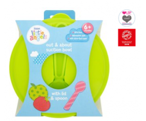 The Asda Little Angels Out & About Suction Bowl with Lid and Spoon 6m+ are great for when you're out and about. Features a lock-tight lid, a wide-handled spoon and a stick-fast base. BPA free, dishwasher friendly.
