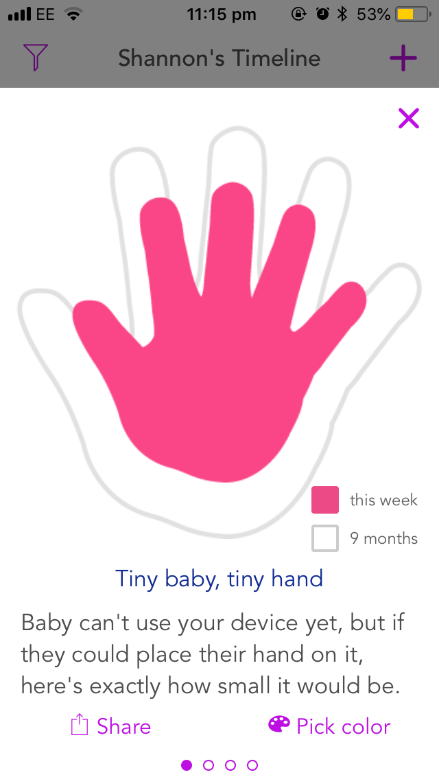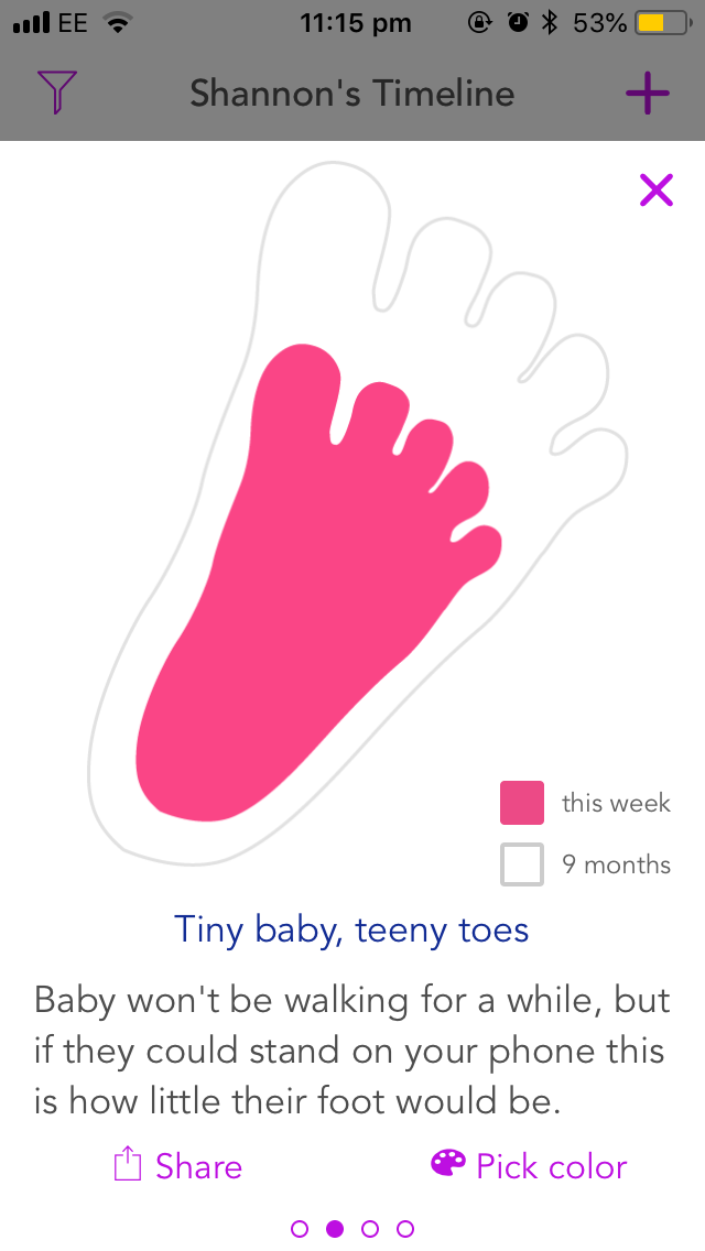 I downloaded several until I came across this. It lets you know how you babies growing, let’s you add in appointments and even shows you what size your babies hands and feet are compared to your phone! I would never go back to any of the other apps. - Strengths: