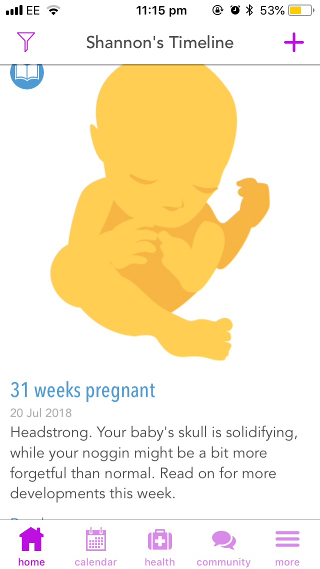 This app is brilliant. We used the ovia conception app first so it made perfect sense to use this one throughout my pregnancy. It gives you daily snippets of advice such as how to handle morning sickness, what vitamins you should be taking, the importance of hydration etc. Then every week you get a full update on what is going on with baby's development that week and what you might experience that week. There’s also a community chat where you can ask other Mums advice or just have a moan!