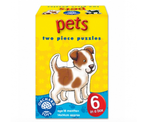 This is an Orchard Toys Pets Puzzles. It's a collection of 6 x 2-piece puzzles with a fun animal theme.