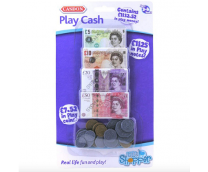 This Casdon play cash set helps develop early money mnagement skills. Contains £1125 in play banknotes in £5, £10, £20 and £50 denominations, as well as a variety of play coins.