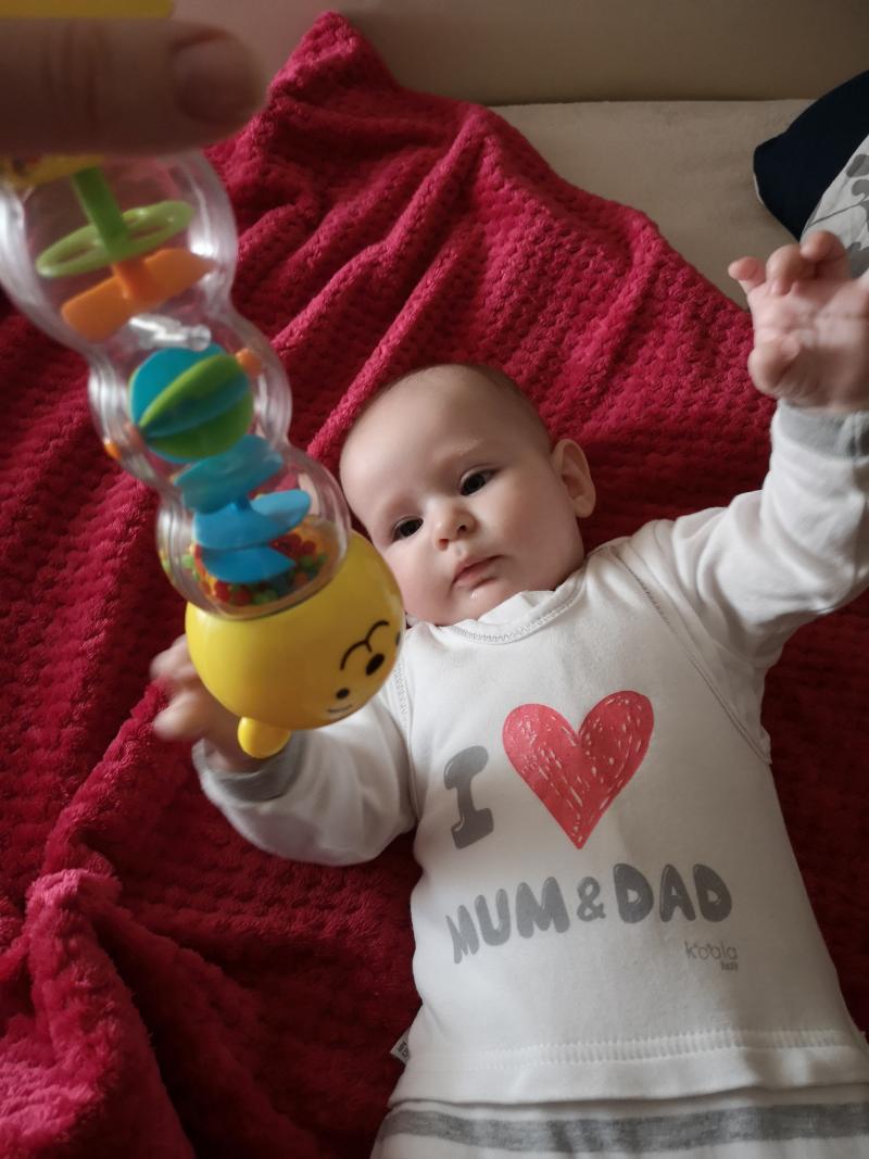 Baby loves the toy keeps trying to hold it with one hand and rattle it as he loves the sound of the beads. They move fast us and down so lots of interest. The toy is also bright colour. The only thing is that it’s a bit heavy and he’s only got small hands so sometimes when he’s too exited he does bang his head with it. But it hasn’t put him off it. - Strengths: