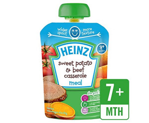 Heinz Savoury Pouch Sweet Potato And Beef Casserole: A blend of mashed sweet potato, beef & vegetables enriched with iron. Packaged with a wider spout to accommodate the texture, which encourages chewing.