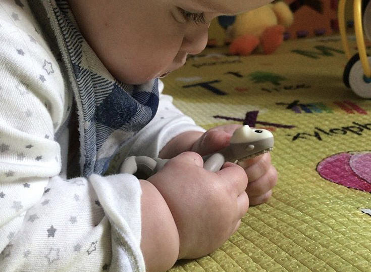 Easy for baby to hold, he loves putting all parts of it in his mouth and loves to rub the bristled head along his gums. - Strengths: