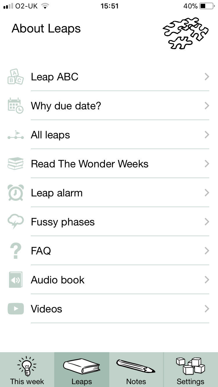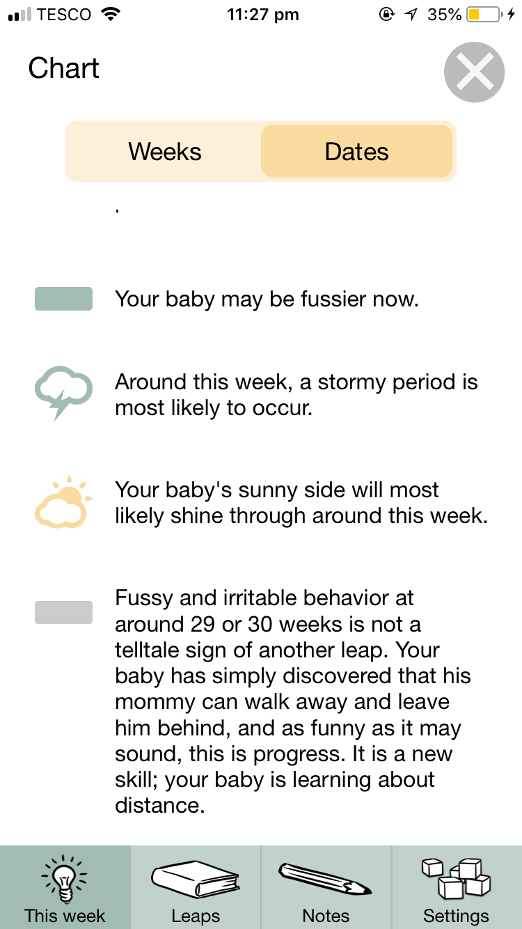This was very reassuring in the early days when trying to understand why our babies were unsettled. I liked being able to read what the developments were in each leap. However, I found that the dates and weeks were completely inaccurate for our girls, even when using their due date rather than actual birth date. - Strengths: