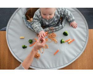 If baby led weaning the soft grey perfectly contrasts baby's food, and the large surface area encourages them to learn about their food through play with no worry of mess. The connected bib Velcros to the tray to eliminate the gap between highchair and baby meaning more food goes in their tummy than in their lap!