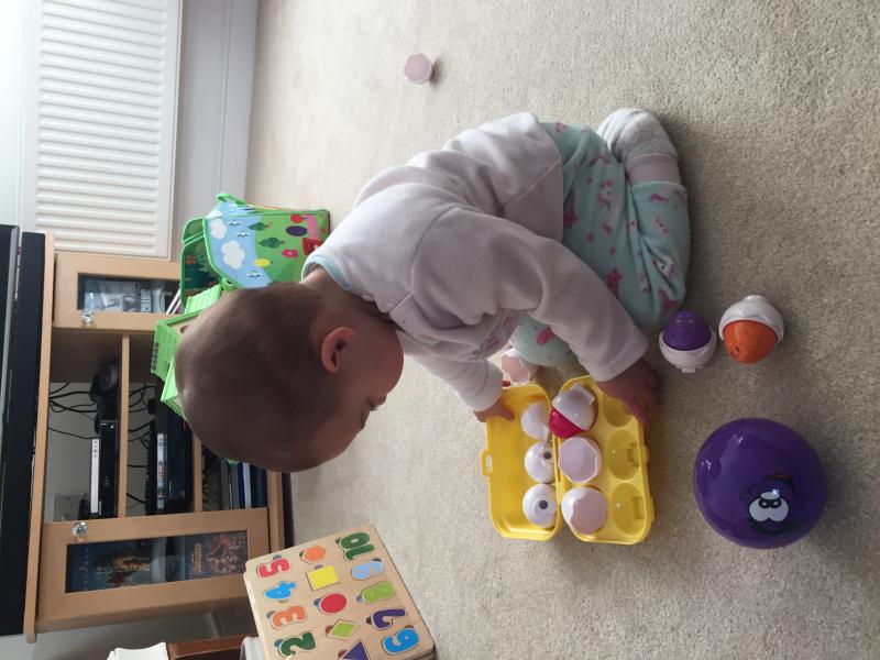 This you keeps both my boys entertained! They are 4 and 7 months! My 7 month old enjoys feeling the eggs and enjoys the squeak that they make! They are easy for babies to hold and can pass them easily. They last for a while as my 4 year old enjoys recognising colours, matching the shapes, role playing with them and learning to share with his brother! - Write a review