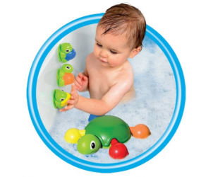 The Tomy Turtle Tots Bathtime Fun is great fun in the bath. Great for baby's motor skills, the turtle tots sucker onto the mummy turtle's shell, as well as all around the bath! They also squirt water. Removing mummy's shell reveals 4 pouring cup legs in bright colours. Remove the legs to pour and shower water, then have fun shape sorting them back into place to tidy away!