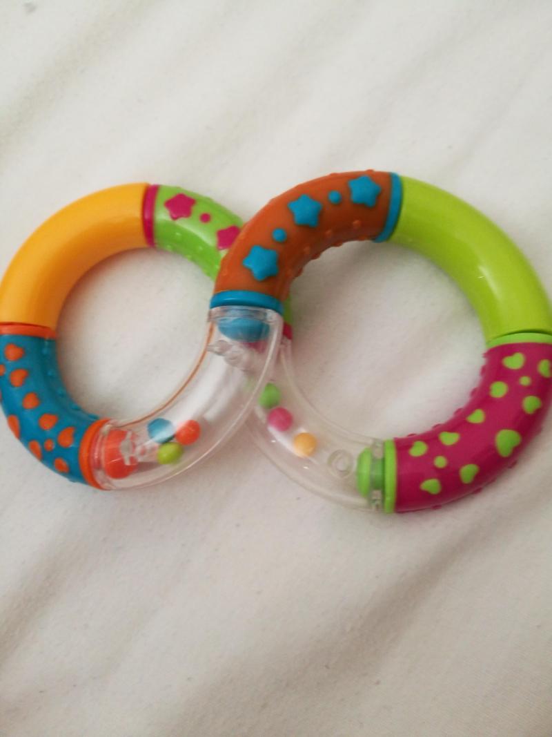 The "8" shaped one twists and turns around along with being a rattle also. Really cool. The green and pink one was a little bigger than expected but it does the job right. - Strengths: