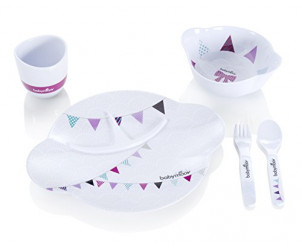 This Babymoov Weaning Set consists of a colourful plate, bowl, cup, spoon, fork.